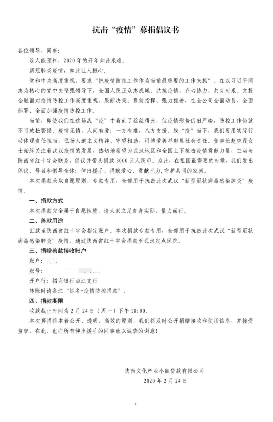 庚子开年疫情蔓延牵动亿万人的心。当前,疫情形势仍然严峻,疫情无情人有情,同舟共济战疫情。文投金融始终关注武汉疫情发展,热切希望为一线抗击疫情贡献微薄力量,在董事长赵晓霞女士倡议和带领下,于2月24日面向全体员工发起了“守望相助 共克时艰 抗击‘疫情’”爱心募捐活动。