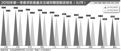 21世纪经济报道记者此前在西安采访期间了解到,西安企业员工工资收入不高,较难吸引高端人才。报告最新数据显示,西安企业平均支付薪资一定程度上有所提升,2019年一季度西安企业平均支付薪资同比增长10.58%,超过求职者期望薪资涨幅,达到6615元/月。