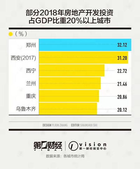 其中,房地产依赖度超过30%的城市除了西安还有郑州。统计公报显示,2018年,郑州全市累计完成房地产开发投资3258.4亿元,当年郑州的地区生产总值为10143.32亿元,其房地产依赖度为32.12%。